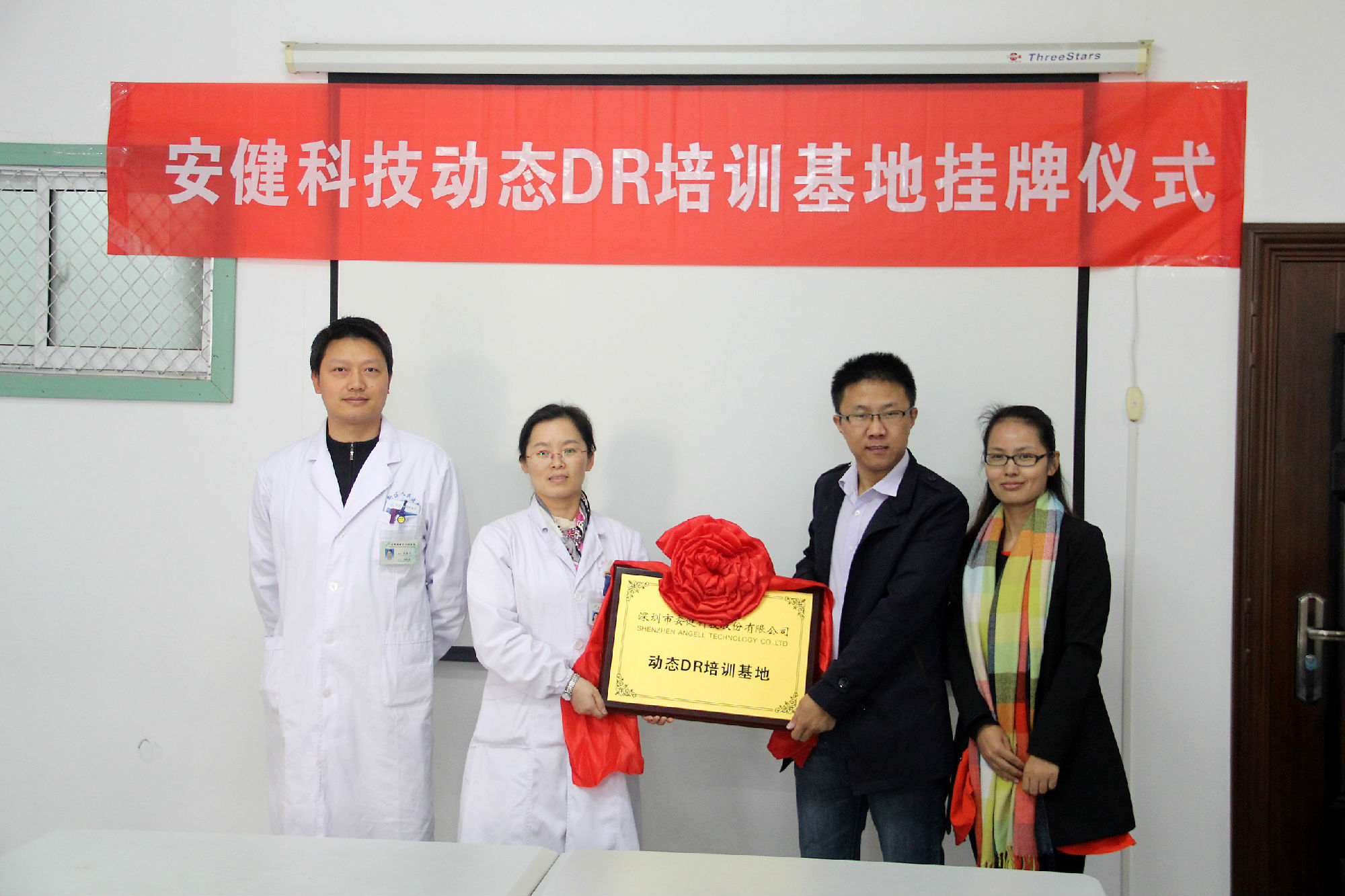 从左至右:苏州高新区人民医院放射科主任吴春华、副院长唐志红、德赢VWIN科技客服总监吕锦阳、产品经理杨博代表双方出席授牌仪式。